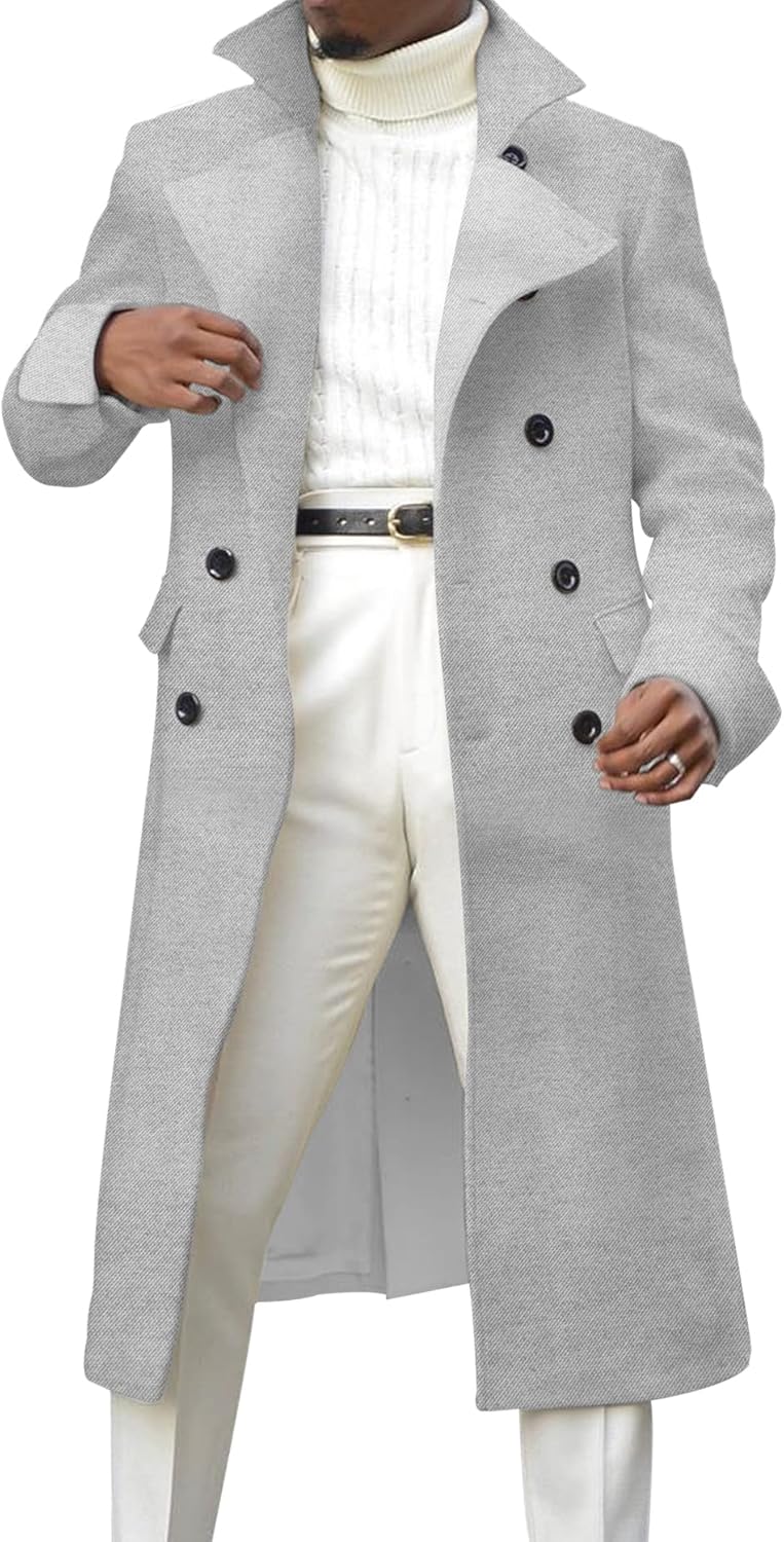 Men’s Notch Lapel Double Breasted Long Trench Coat Casual Cotton Blend Peacoat