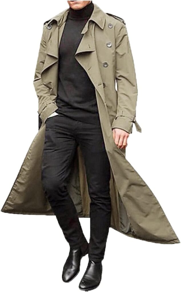 - Features:This Men’s trench coat features double breasted, slim fit, over knee length,classic design, 2 side pockets, solid color, lapel collar, long and belted in waist, providing for versatile styling options to show your stylish.