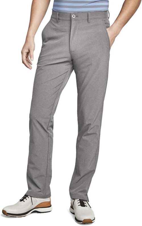 - Everyday comfort designed to perform on or off the course, Breathable, moisture-wicking woven stretch fabric feels soft and lightweight, Wrinkle-resistant and quick drying, Provides 50 UPF sun protection, Stretch waistband adapts to movement, inner grips keep shirt tucked in, Belt loops, Mesh-lined side pockets, Back besom pockets; one with zipper, 90% Polyester, 10% Spandex.
